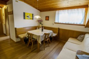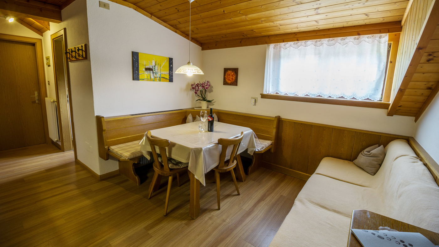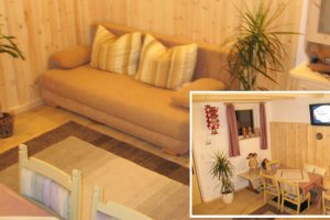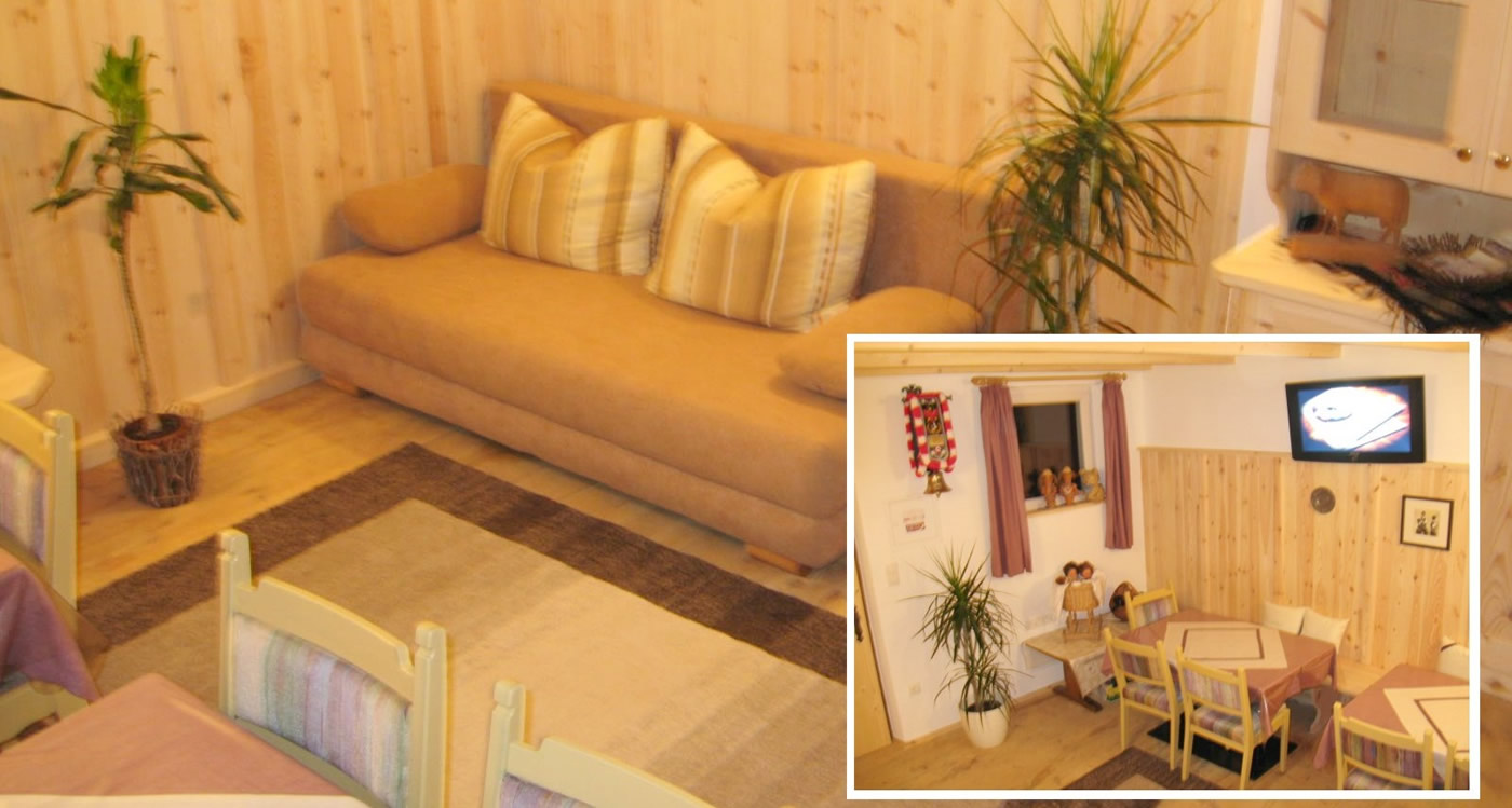 - Wohnraum mit Esstisch, Eckbank, ausziehbarem Sofa, Sat-TV-Radio