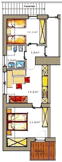 - 2 getrennte Schlafzimmer (1 Doppelbettzimmer, 1 Zimmer mit 2 getrennten Betten)